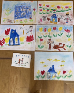 読み聞かせのあとにそれぞれが好きなページを選んで絵を描きました。