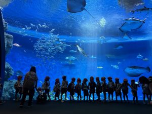 海の中にいるような大水槽には、鋭い動きで泳ぐサメや、ゆったりと泳ぐエイ、集まって泳ぐお魚の大群など、何時間でも見ていられそうな光景に子どもたちは心を奪われていました。