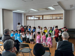 劇を観ていただいた後は、「ともだちになるために」の歌を歌ったり、おじいさんおばあさんとペアになって、みんなが大好きな「カマキリマッサージ」という体操や「幸せなら手をたたこう」の手遊びなどを一緒に楽しんだりしました。