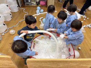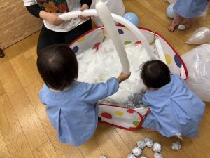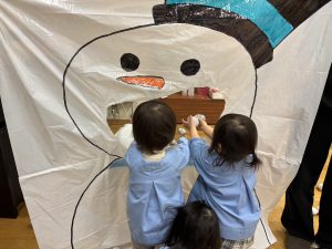 綿(わた)や新聞紙で作った雪ボールや、風船を雪に見立てて遊んだり、大きな雪だるまの口に新聞紙で作った雪などを投げたりして遊びました。