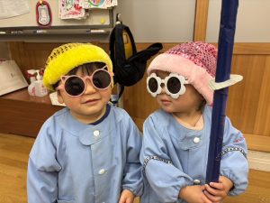 眼鏡や帽子をつけてスキー靴を履いたり、スティックを持ってスキーごっこもしました。