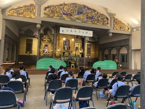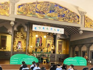 本堂では、紙で作ったお花をお供えして、お焼香をし、お勤めの仏さまのお歌を歌ったり、お坊さん(園長先生)のお話を聞きました。